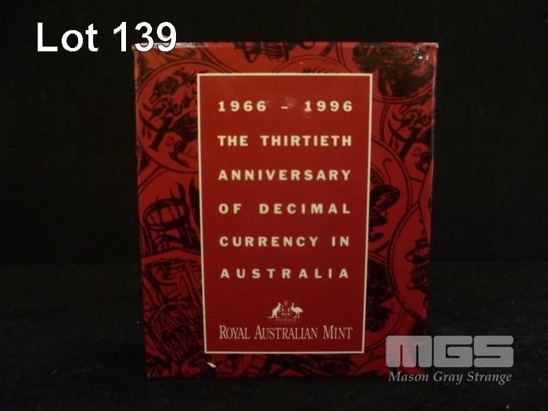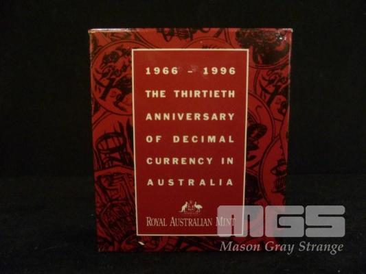 1996 PROOF 1 TROY OZ FINE SILVER COIN " 30 YEARS OF DECIMAL COINAGE" IN DISPLAY BOX