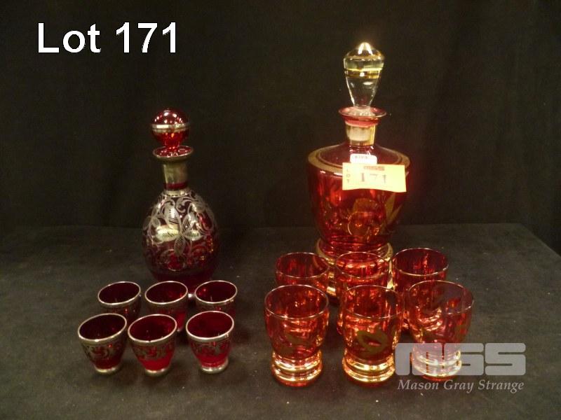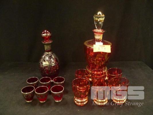 2 x SETS RED RUBY GLASS DECANTERS WITH GLASSES