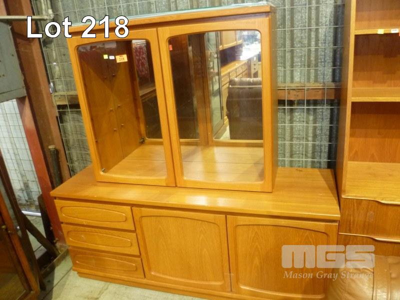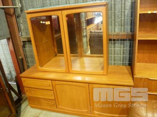 TEAK 2 PIECE SIDEBOARD WITH DISPLAY HUTCH, 3 DRAWER, 2 DOOR UNDERSTORAGE WITH MIRROR BACK DISPLAY CASE, 3 x GLASS SHELVES