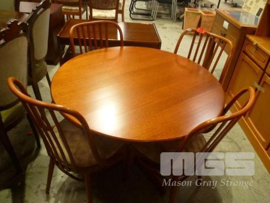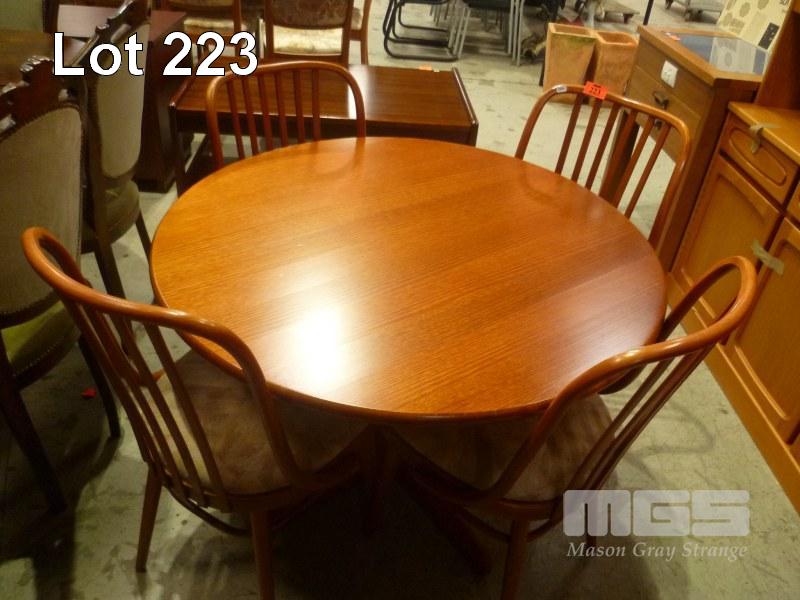 TIMBER 5 PIECE DINING SUITE INC ROUND TABLE, SINGLE PEDESTAL & 4 x CURVED BACK DINING CHAIRS