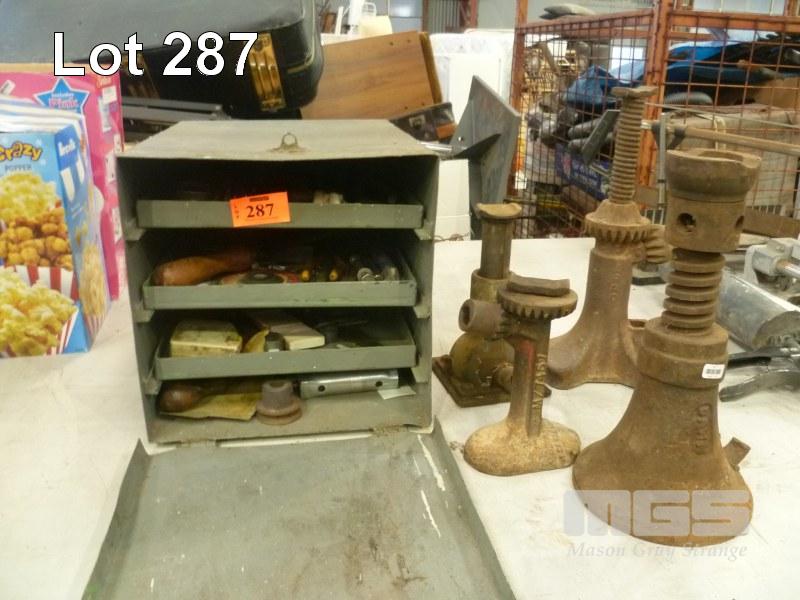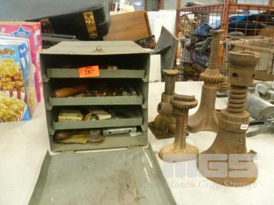 STEEL PARTS DRAWER &CONTENTS, 4 x VINTAGE BOTTLE JACKS INC DAWN