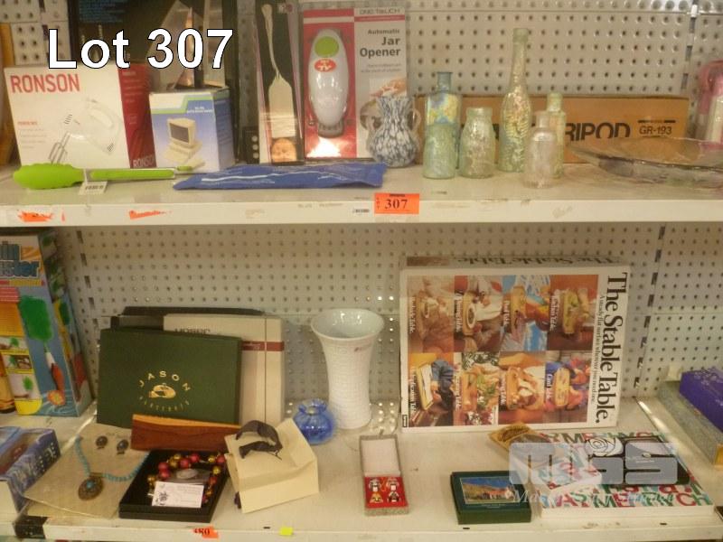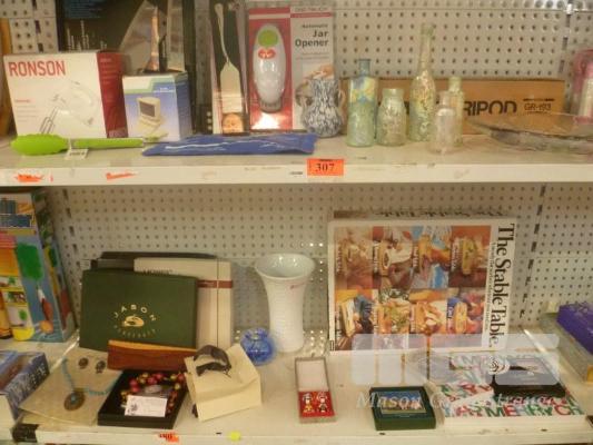 VINTAGE BOTTLES, KITCHENWARE, PLACEMATS, DRESS JEWELLERY, STABLE TABLE, ETC, 2 x SHELVES
