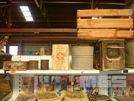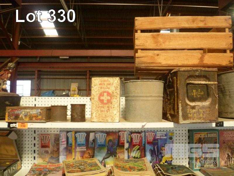 VINTAGE TINS INC FIRST AID, AMMO BOX, PAPER LABEL WESTERNS, ETC