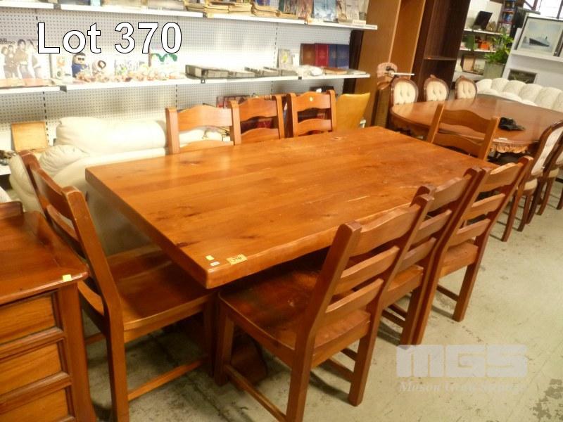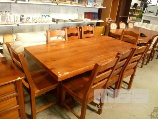 RUSTIC PINE, 9 PIECE DINING SUITE INC RECTANGULAR TABLE, STRETCHER BASE & 8 x SLAT BACK DINING CHAIRS