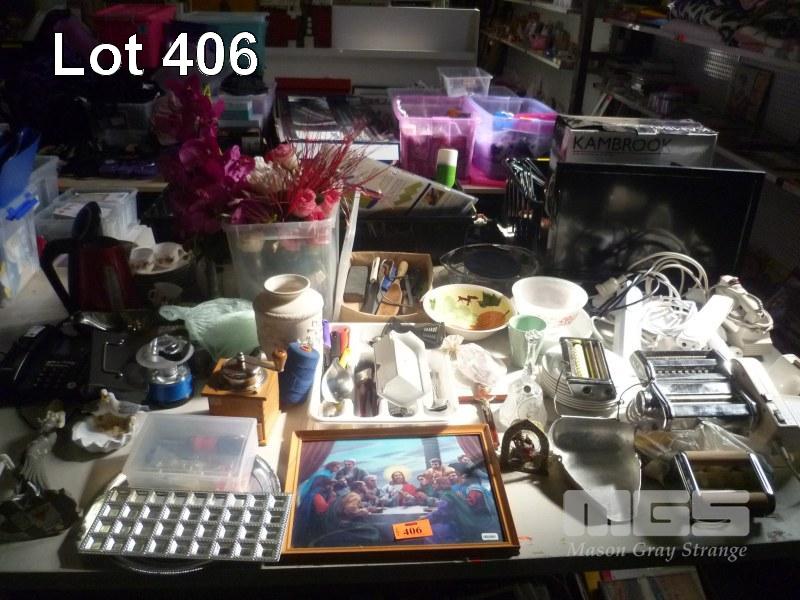 KITCHEN UTENSILS, PASTA MAKER, ARTIFICIAL FLOWERS, TELEPHONE, LG 22" LCD TV WITH REMOTE, ETC