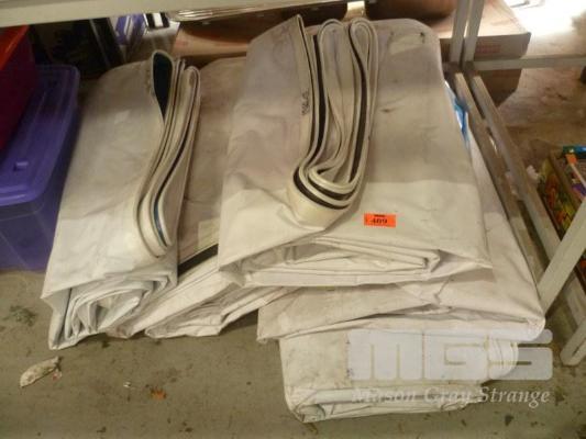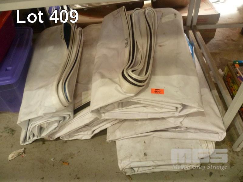 5 x ASSORTED, HEAVY DUTY ADVERTISING TARPS, UNKNOWN SIZES