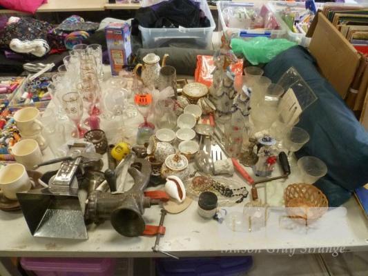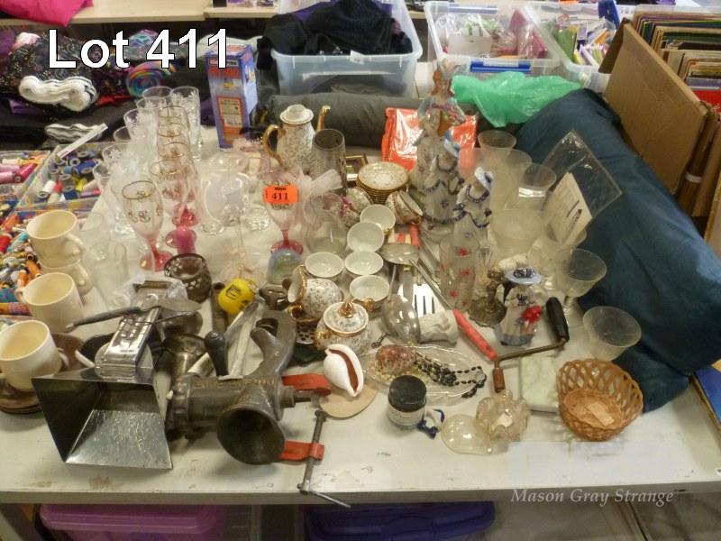 ASSORTED GLASSWARE, MEAT MINCER, CAMPING TENT, ETC