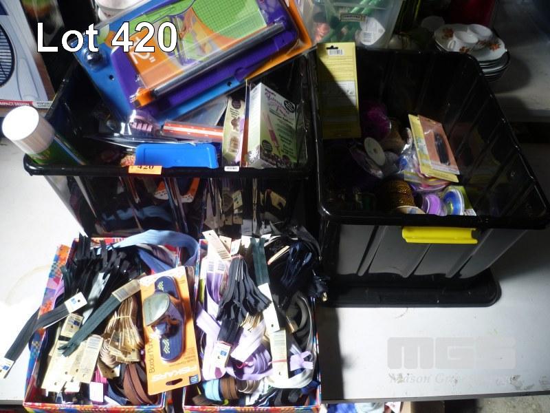 ASSORTED CRAFT RIBBONS, ZIPS, CUTTERS, ETC, 2 x TUBS & 2 x TRAYS