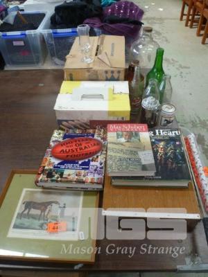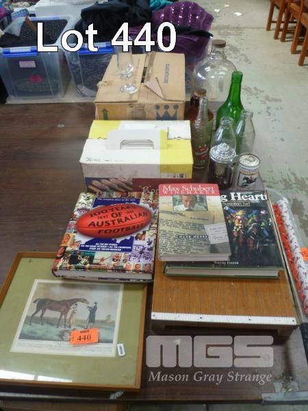 BORDEX WINE RACKS, VINTAGE BOTTLES, GLASSES, BOOKS, PAPER GUILLOTINE, ETC