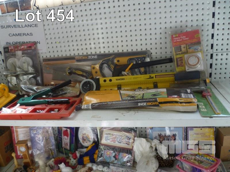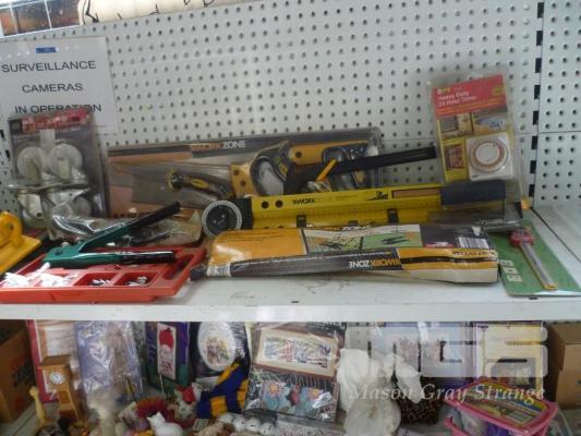 NEW OLD STOCK HAND TOOLS INC BOLT CUTTER, HAND DRILL, POP RIVET GUN, SAWS, LEVEL, ETC