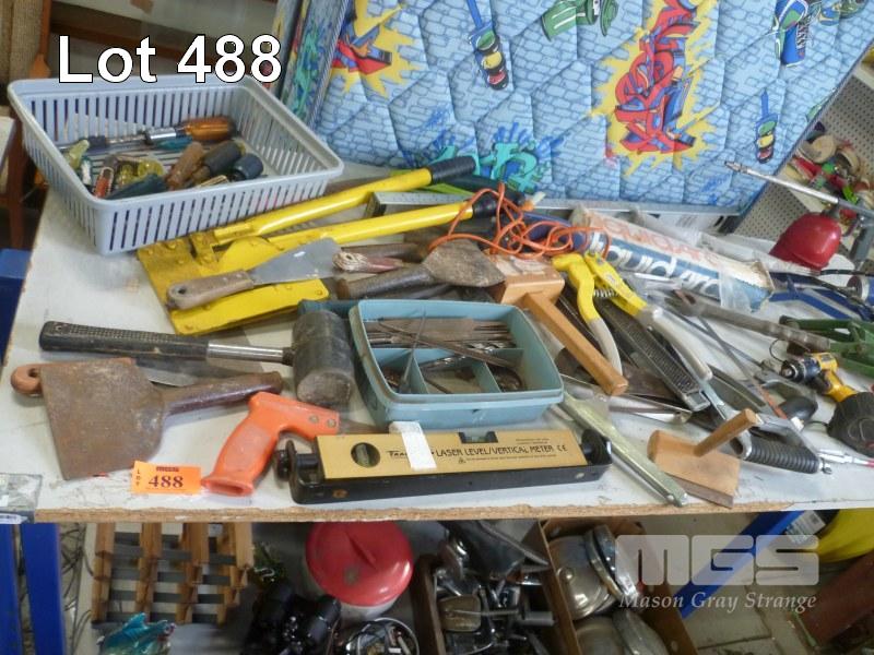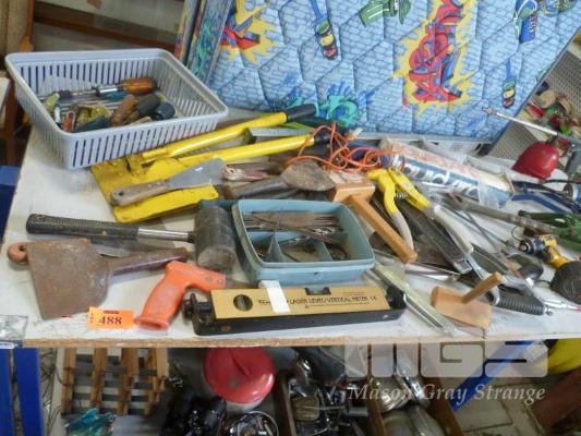 ASSORTED WORKSHOP TOOLS INC WELDING RODS, TYRE PUMPS, SHEET METAL CUTTER, LEVEL, WRENCHES, CLAMPS, ETC, 1 x SHELF