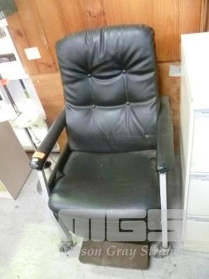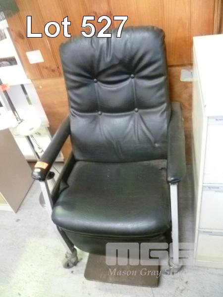 BLACK VINYL UPHOLSTERED MOBILE RECLINING HOSPITAL DAY CHAIR.