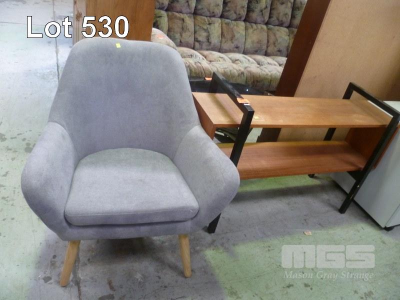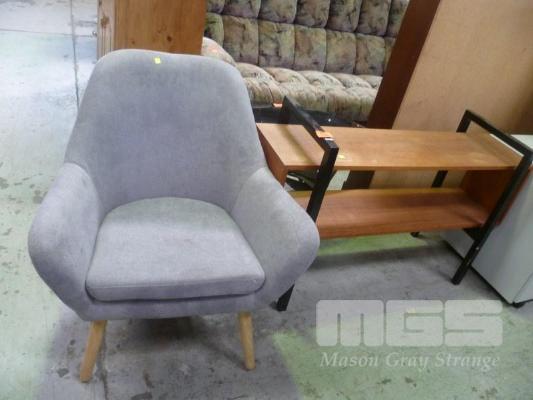 MID CENTURY SHELF UNIT & GREY FABRIC TUB CHAIR