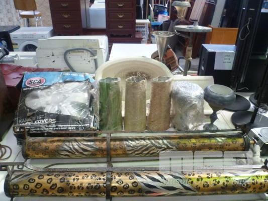 ART DECO SMOKERS STAND, SET OF 4 WHEEL COVERS, VASES, BASIN, ETC