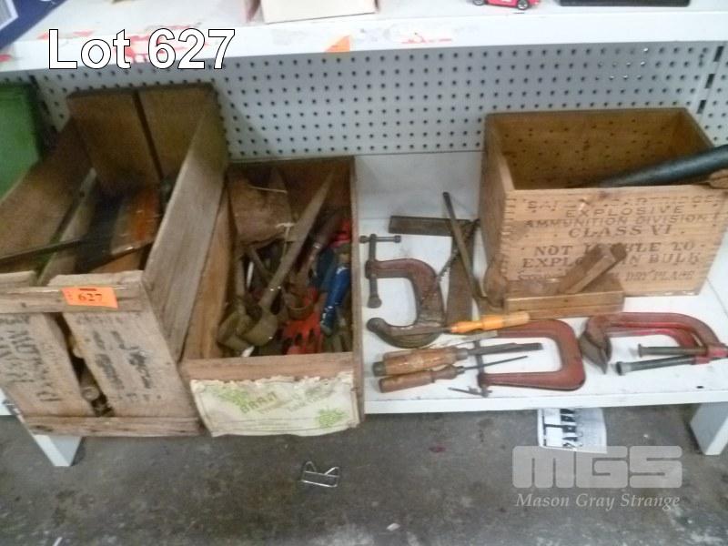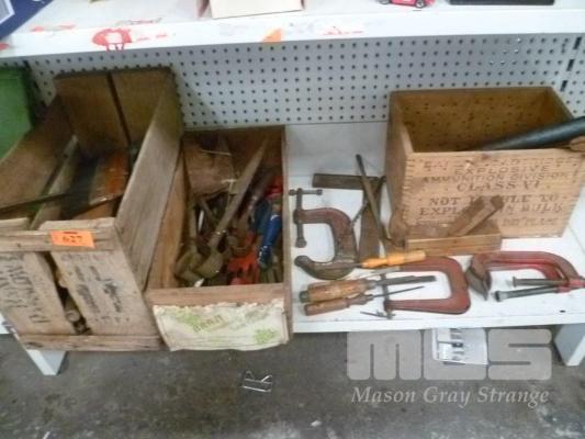 VINTAGE HAND TOOLS, G-CLAMPS, PLANE, CHISELS, ETC