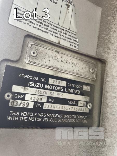1999 ISUZU NKR-200 TRAYTOP TRUCK REG: WHE 085 VIN: JAANKR66EW7100547 ODO: 590,000kms + GVM: 4,200kg ALLOY DROP SIDE TRAY, 3.6m