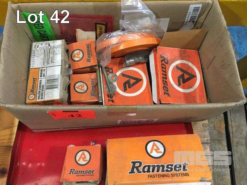 HILTI EXPLOSIVE FASTENER FIXING TOOL, TYPE: DX100 IN TOOLBOX WITH ASSORTED HILTI & RAMSET CONCRETE STUDS, ETC