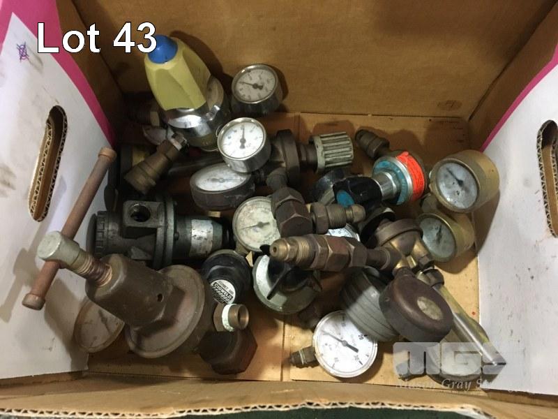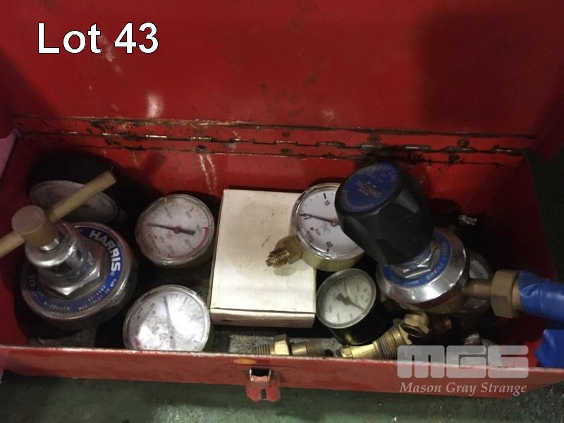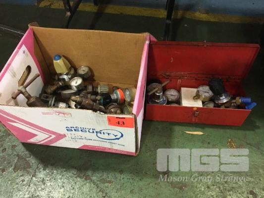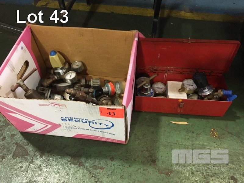 ASSORTED GAS REGS & GAUGES INC MIG O MAG INERT GAS, HARRIS ARGON, COMWELD ON TOOL BOX & CARTON