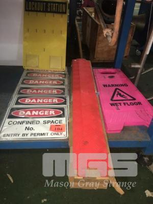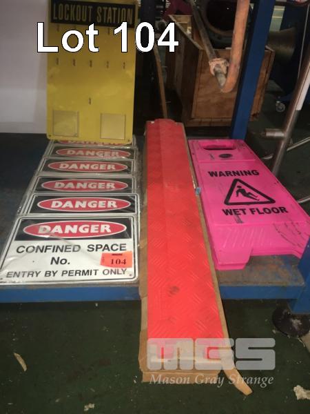 6 x DANGER CONFINED SPACE SIGN, 1 x FAST LANE ELECTRICAL CABLE RAMP OVER & WET FLOOR SIGN, ETC