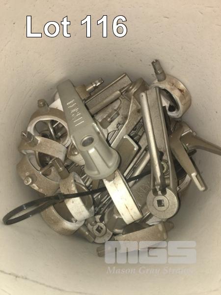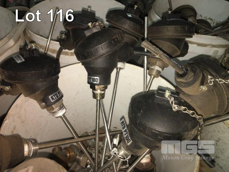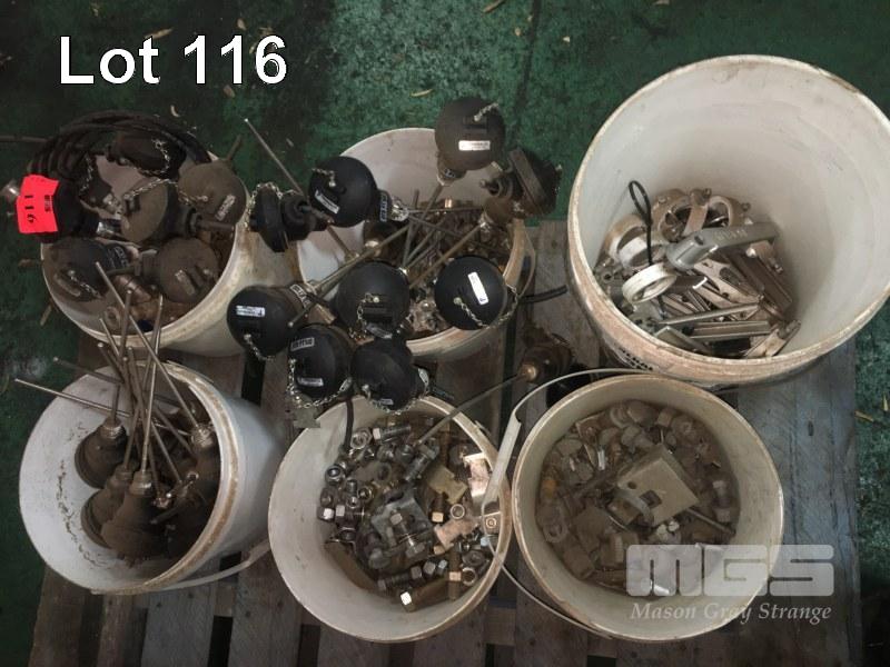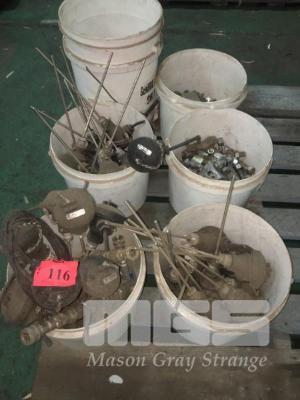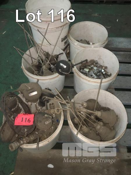 STAINLESS STEEL VALVE BUTTERFLIES & HANDLES, TEMPERATURE PROBE UNITS, NUTS, BOLTS, ETC, 6 x BUCKETS