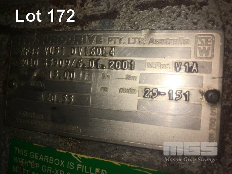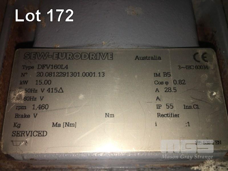 RIGHT ANGLE POWER DRIVE UNIT, SEW-EURODRIVE TYPE: KF86-VUS1DV160L4 RATIO: 20.55:1 R/MIN: 25-151 POWERED BY SEW, 15kw, 415V MOTOR 1 x PALLET