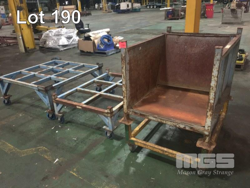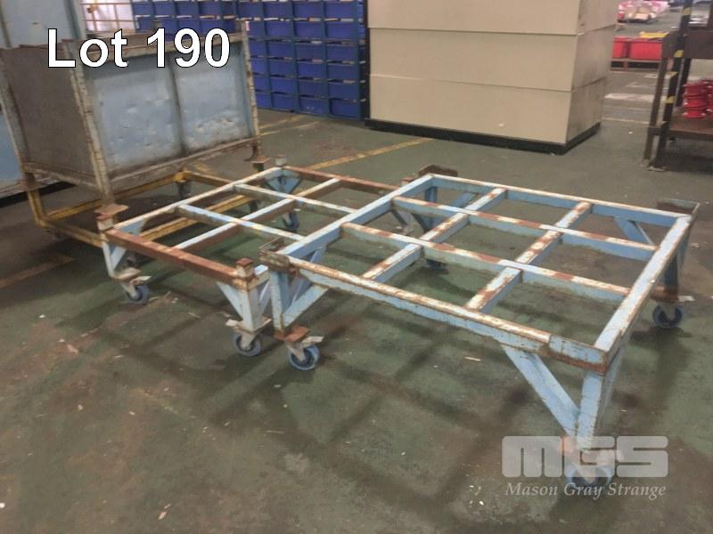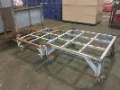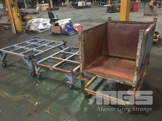 1 x PALLET TROLLEY WITH CASTOR WHEEL, HEAVY DUTY STEEL FRAME, 1260 x 1210 x 550mm (H) & 2 x STILLAGE TROLLEYS, 1 @ 1250 x 950 x 460mm (H) & 1 @ 1100 x 830 x 420mm (H) WITH MATCHING STILLAGE, 1100 x 830 x 820mm (H)