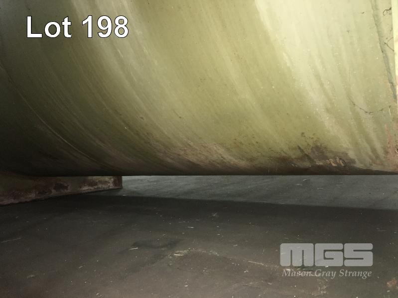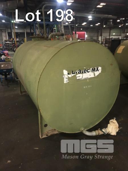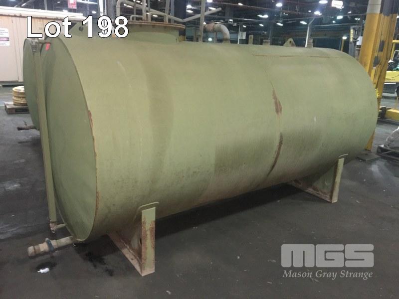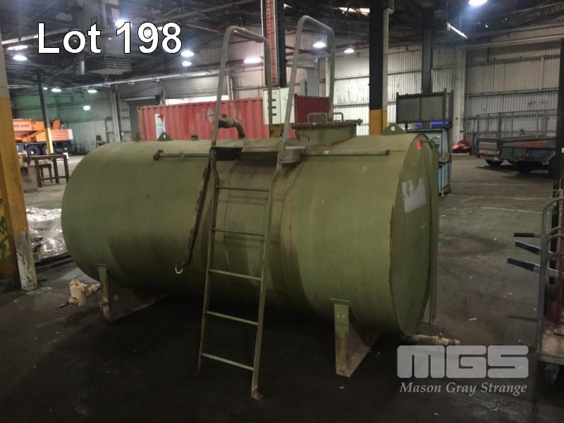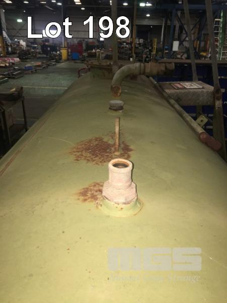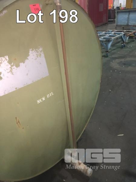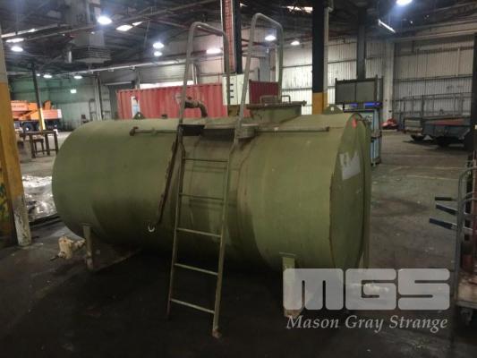 STEEL TANK, CYLINDRICAL, 5300 LITRE CAPACITY HORIZONTALLY MOUNTED ON SUPPORTS 1500mm DIAMETER x 3050 mm (L) TOP LIFTING LUGS, END MOUNT SIGHT LEVEL TUBE SIDE MOUNT ACCESS LADDER (BOLT ON) TO TOP HATCH 2 x BOTTOM OUTLETS WITH VALVES, 3 x TOP MOUNT INLETS & BREATHER PIPE (WAS USED FOR OIL STORAGE) S/N:O
