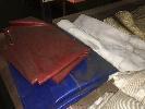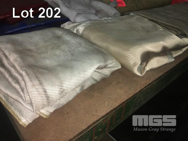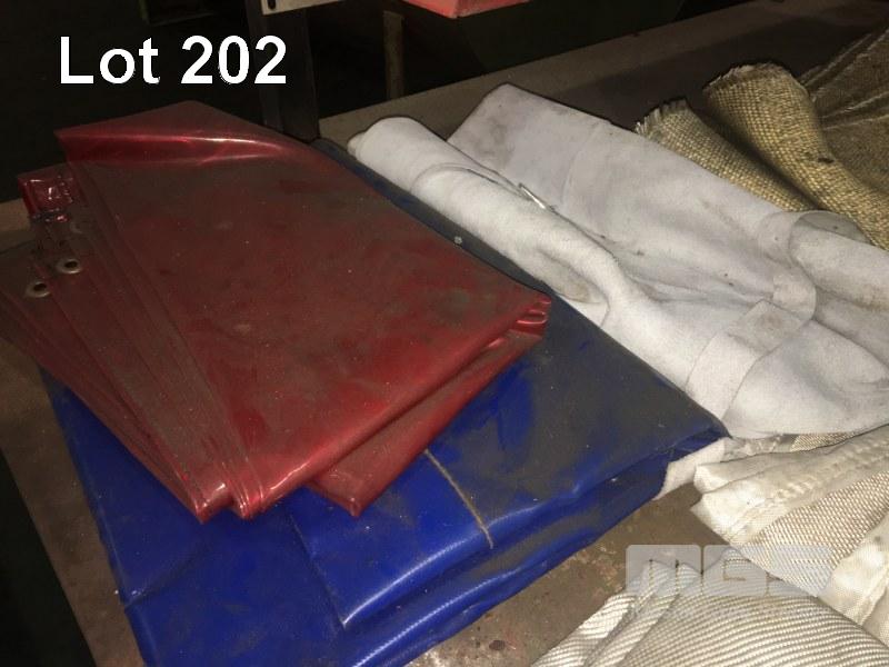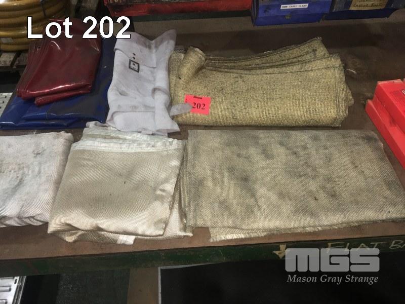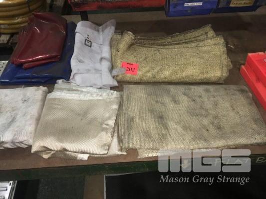 4 x GLASS FIBRE WELDING ANTI-SPLATTER BLANKETS, ASSORTED SIZES, LEATHER APRON, ARC WELDING SCREEN & SMALL TARP