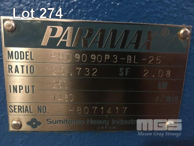REDUCTION DRIVE GEARBOX, PARAMAX MOD: PHD9090P3-BL-25 RATIO: 25.732 SF: 2.08 INPUT: 250kw @ 1480RPM S/NO: H8071417 AS NEW