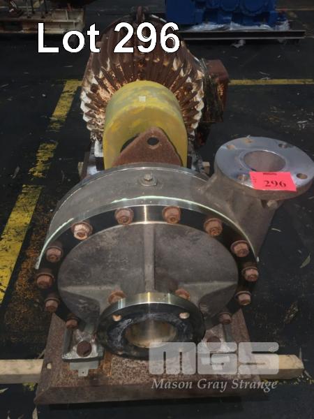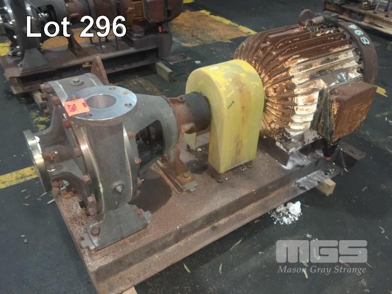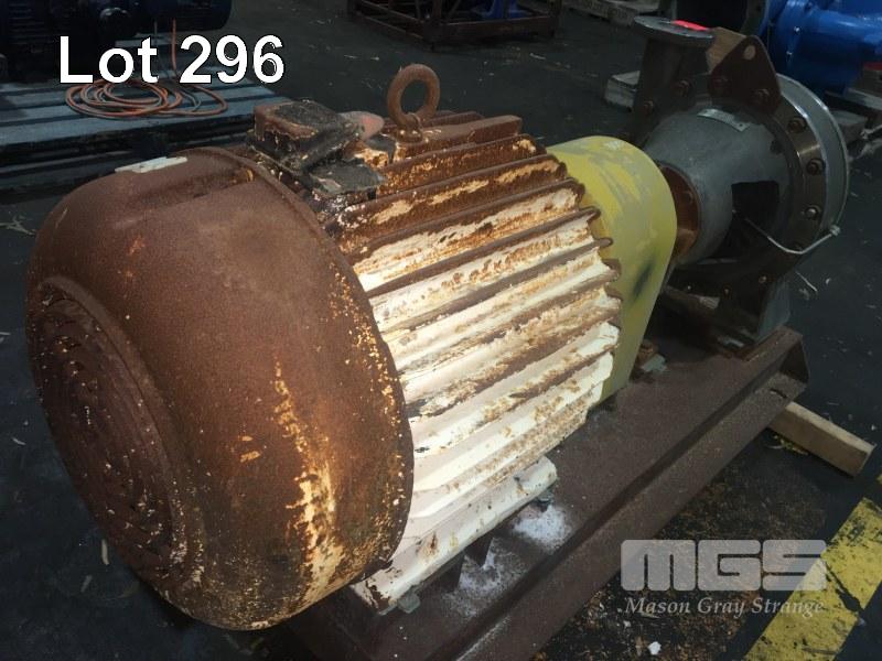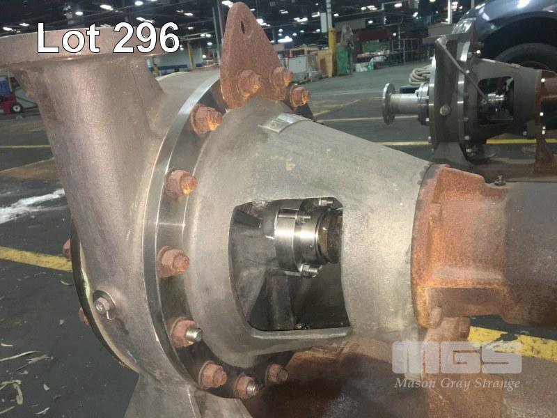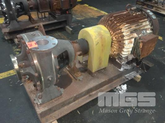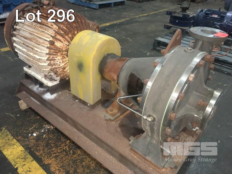 CENTRIFUGAL FLUID TRANSFER PUMP STAINLESS STEEL 100mm INLET 75mm OUTLET 360mm IMPELLER DIAMETER POWERED BY POPE 37kw, 1460RPM, 415V MOTOR SKID MOUNTED