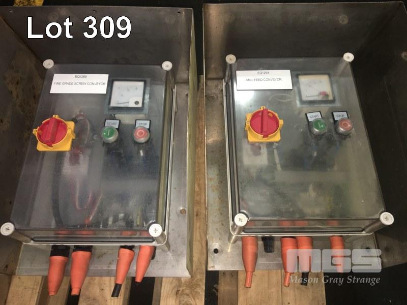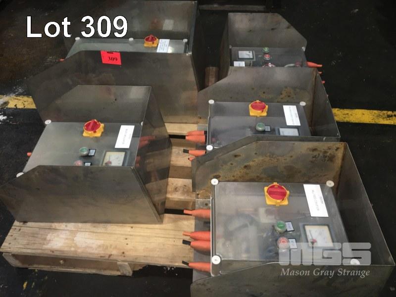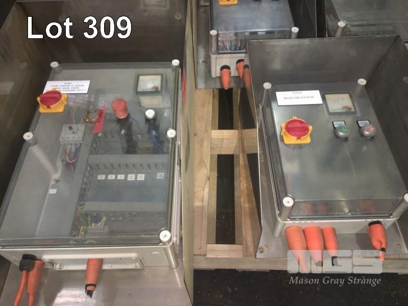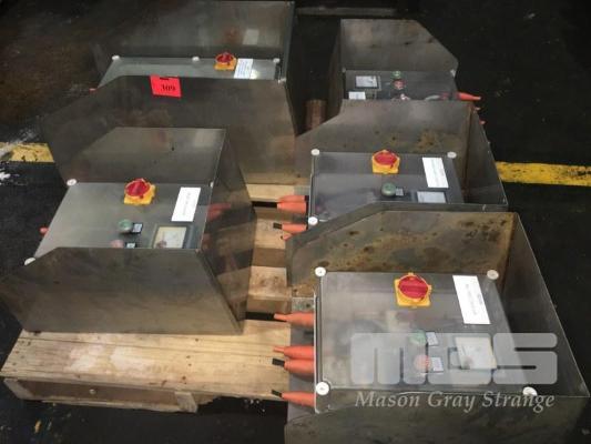 CONVEYOR, ELEVATOR & SCREW CONTROL CABINETS WITH AMP METERS & POWER SUPPLY COMPONENTS MOUNTED IN STAINLESS STEEL ENCLOSURES, 1 x PALLET