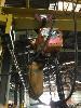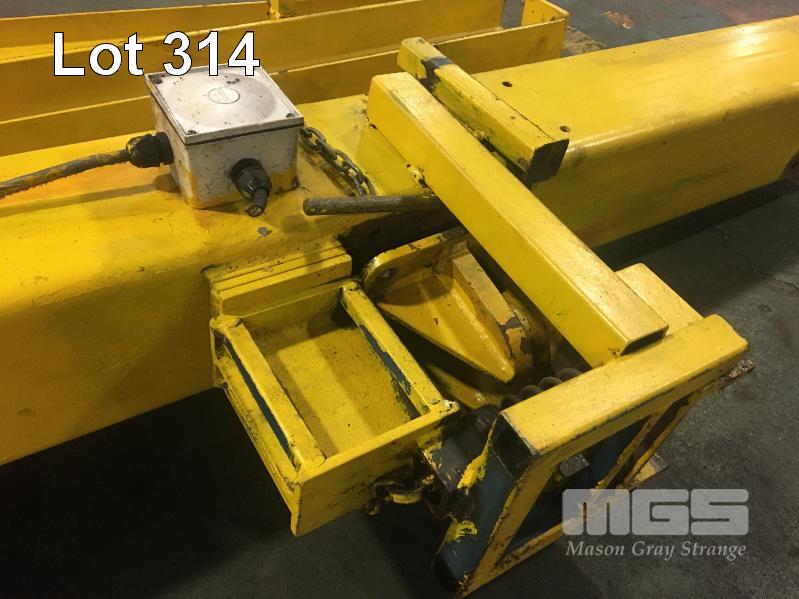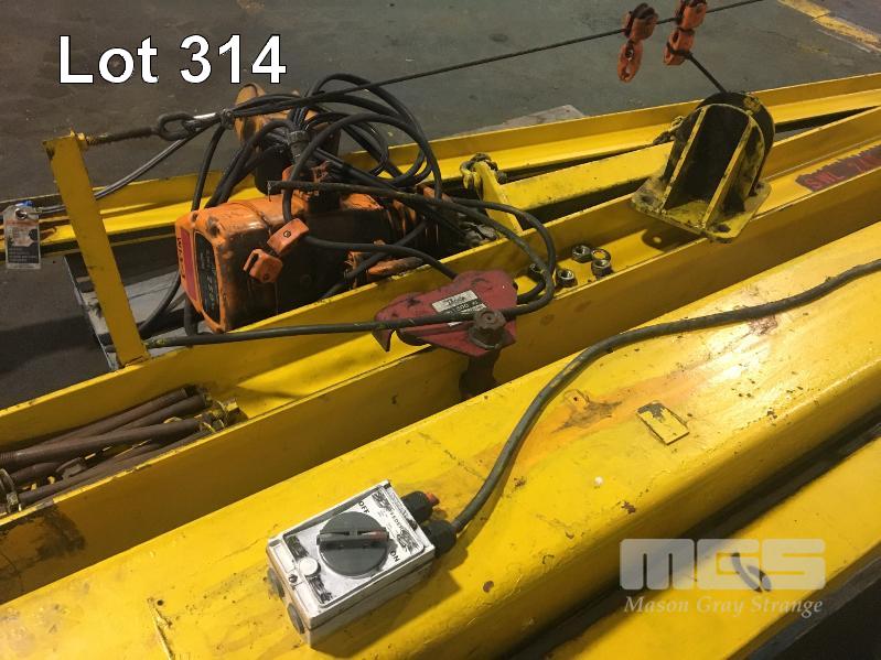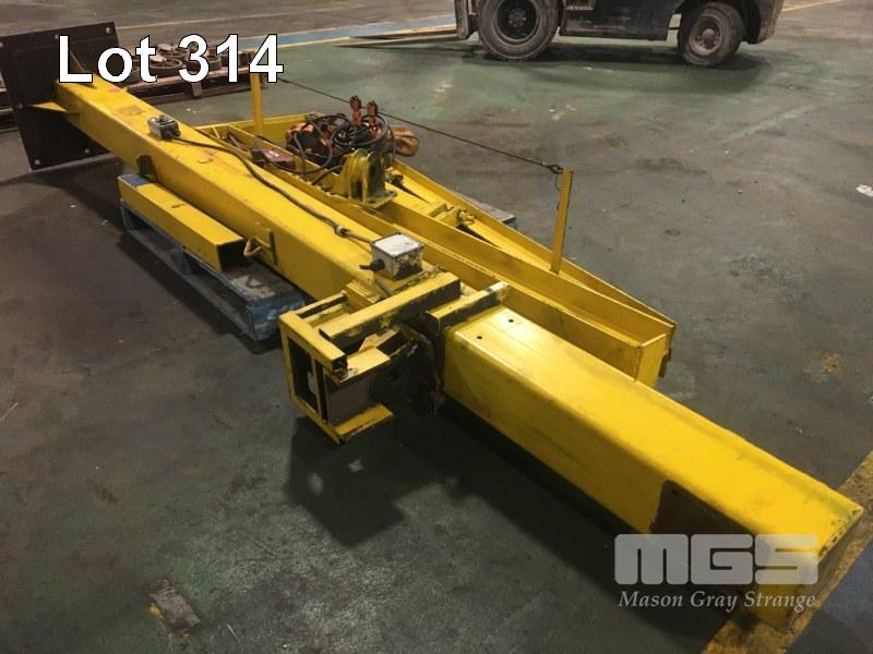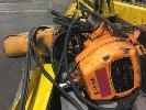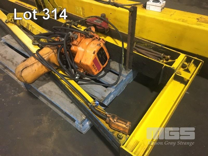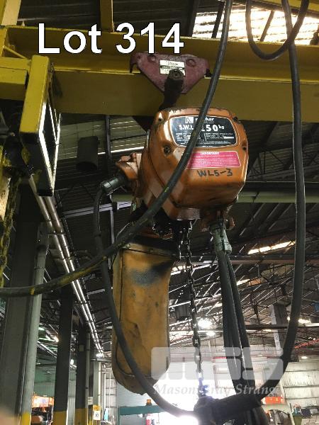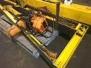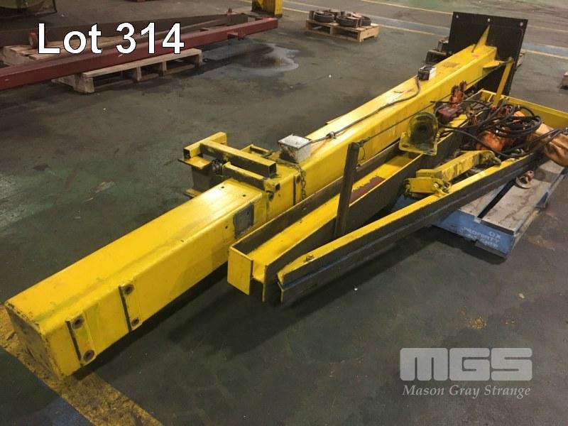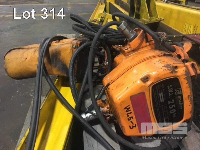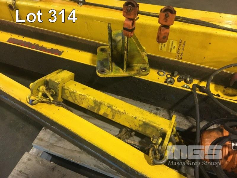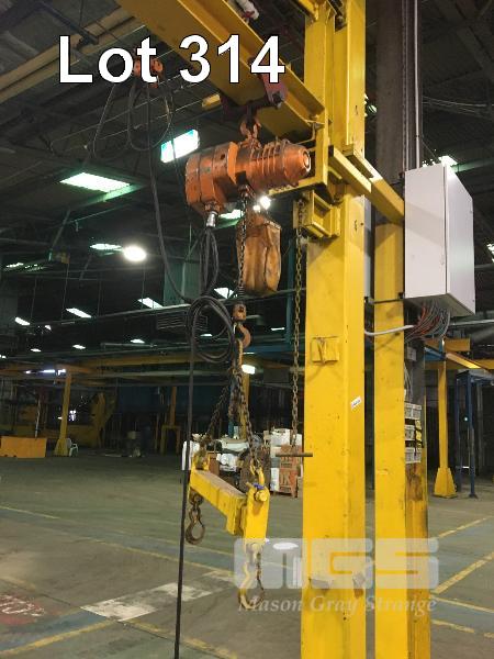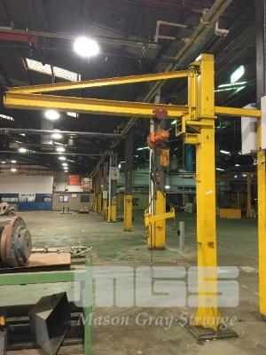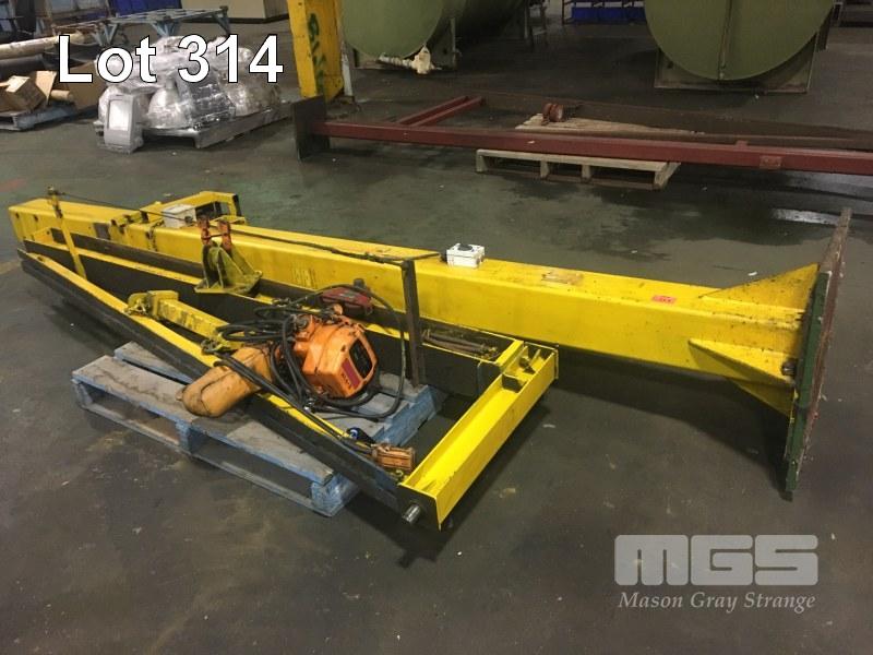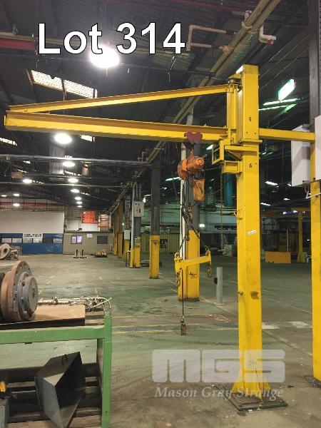 SWING ARM GANTRY, HEAVY DUTY STEEL 200 x 200mm COLUMN HEIGHT: 3850mm ARM LENGTH: 2600mm FITTED WITH BEAM TROLLEY & ANCHOR ELECTRIC CHAIN HOIST MOD: ES0035 SWL: 250kg PENDANT CONTROL, 415V