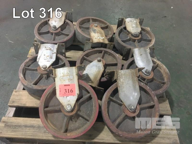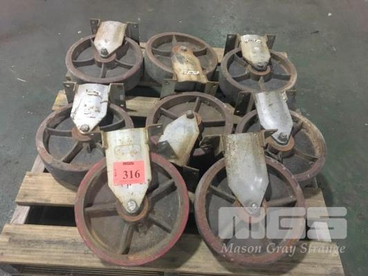 8 x HEAVY DUTY TROLLEY WHEELS, LEMCOL, CAST IRON RIM WITH RED NOLATHAN TREAD, 250 x 60mm