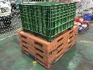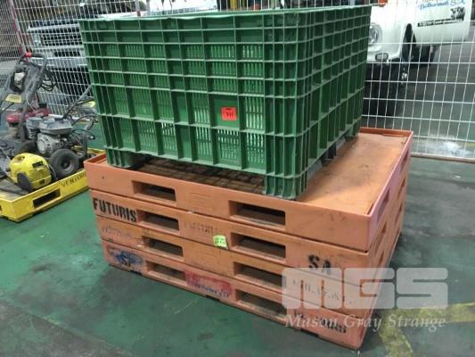 4 x PLASTIC PALLETS, EX HOLDENS, 1160 x 1550mm & 1 x GREEN PLASTIC CRATE, 1150 x 1150 x 750mm (H)