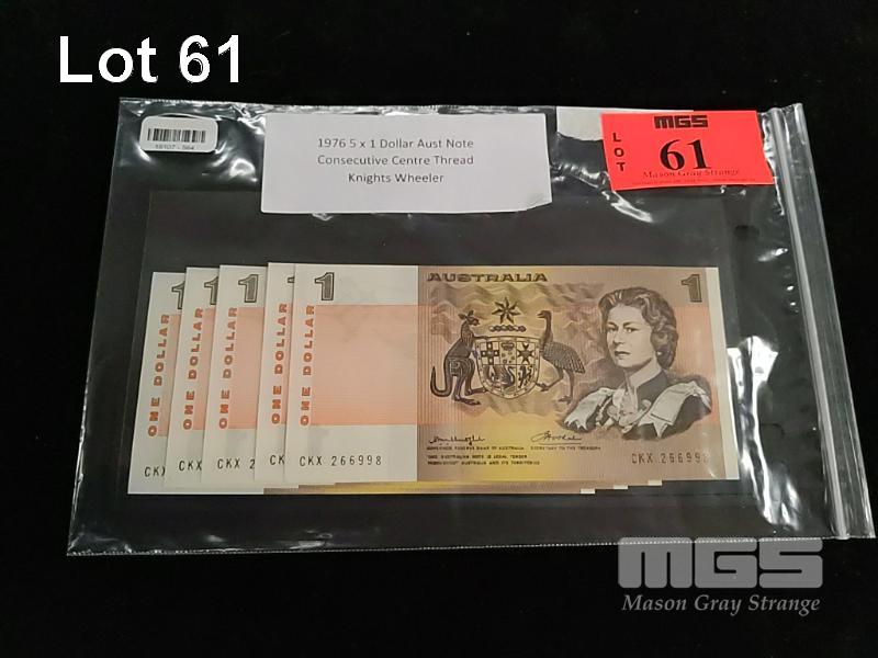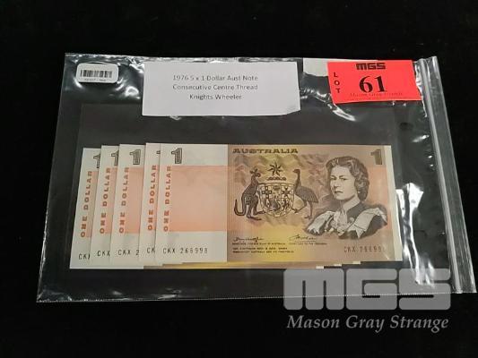 1976 5 x $1.00 NOTES 2 x CONSECUTIVE RUNS, "CENTRE THREAD" KNIGHTS WHEELER UNC