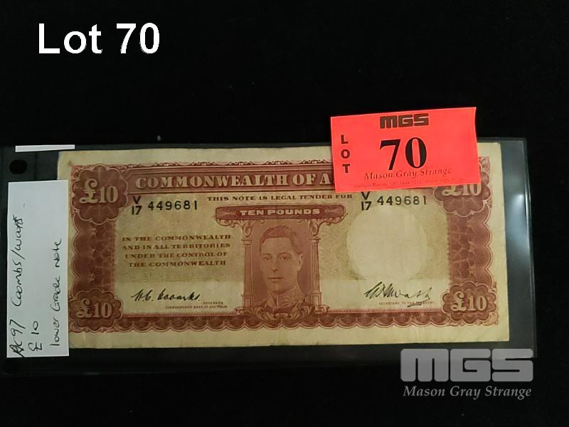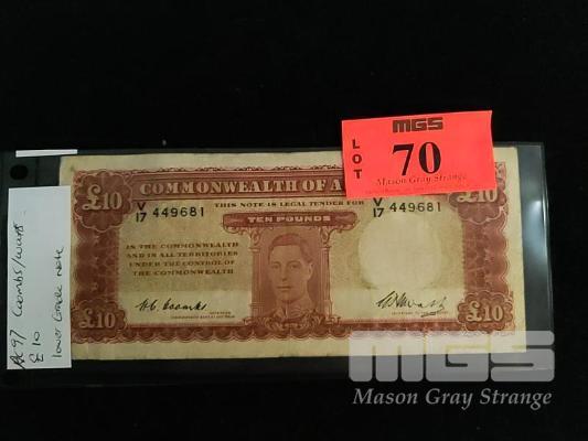 AUSTRALIAN 10 POUND BANK NOTE, COOMBES/WATTS, V PREFIX