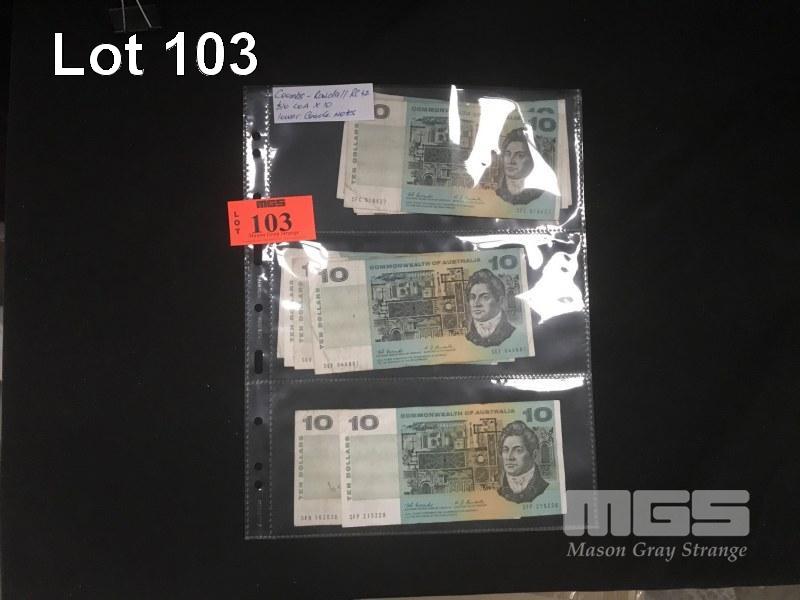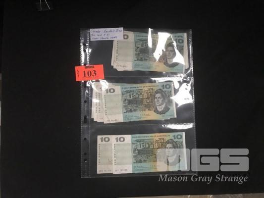 10 X AUSTRALIAN TEN DOLLAR PAPER BANKNOTES, PHILLIPS/RANDALL, S PREFIXES