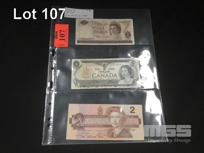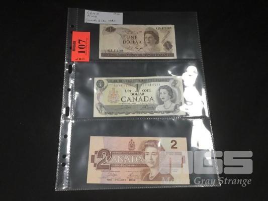 3 X CANADIAN BANKNOTES, 2 X $1, 1 X $2