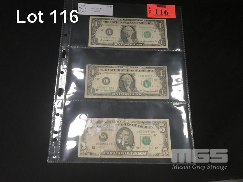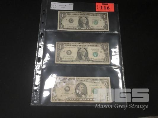 3 X USA BANKNOTES 2 X 1 DOLLAR 1 X 5 DOLLAR