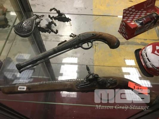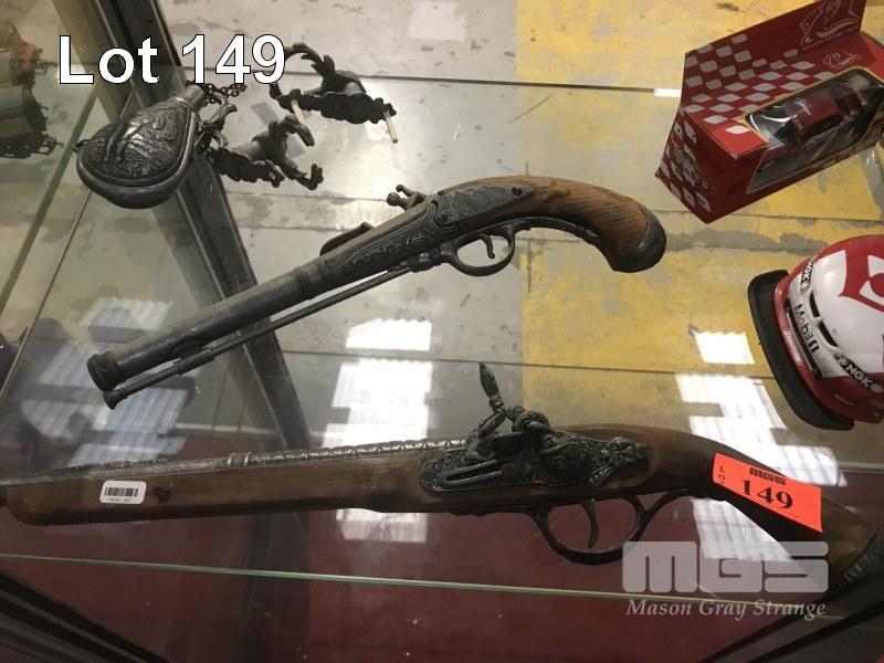 PAIR ORNAMENTAL PISTOL METAL GUNS, POWDER FLASK & MOUNTS FOR WALL