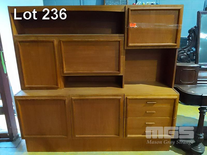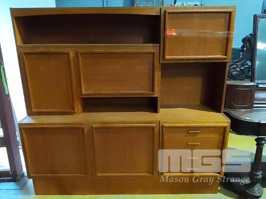 MACROB FURNITURE MID CENTURY TEAK WALL/COCKTAIL CABINET, 3 DOOR ABOVE STORAGE & 2 DOOR, 3 DRAWER UNDER STORAGE