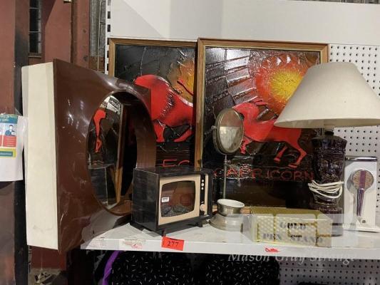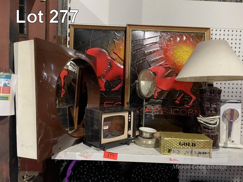 ASSORTED RETRO COLLECTABLES INC BATHROOM VANITY MIRROR, LIGHTS, PICTURES, DESK SET IN BOX, ETC