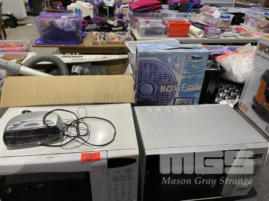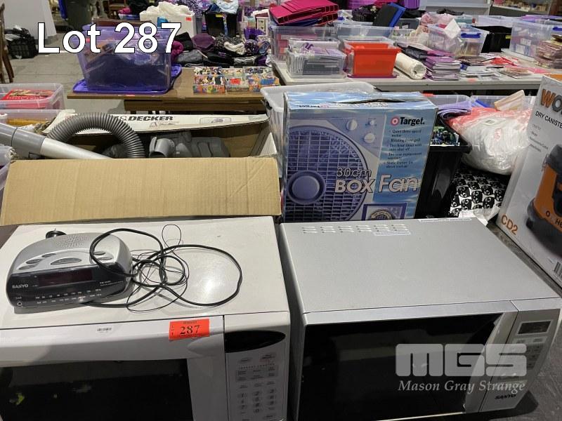 2 x MICROWAVES, SAMSUNG & SANYO, BOX FAN, B&D VACUUM & ALARM CLOCK