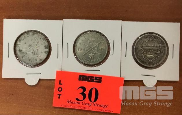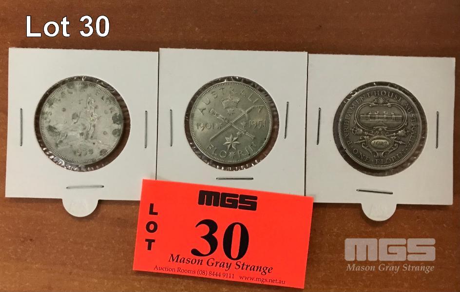 3 X AUSTRALIAN COMMEMORATIVE FLORINS, 1927 PARLIAMENT HOUSE, 1951 FEDERATION JUBILEE & 1954 ROYAL VISIT