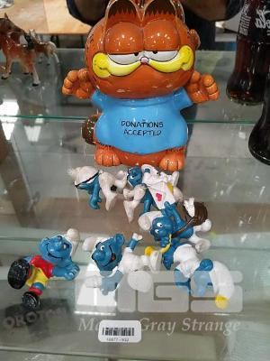 VINTAGE CERAMIC GARFIELD MONEY BOX & ORIGINAL SMURFS