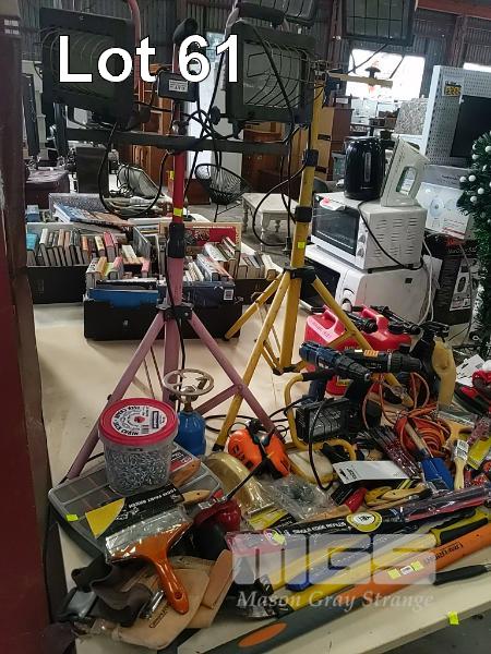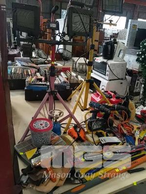 COLLECTION OF HOME WORKSHOP TOOLS INCLUDING FLOOD LIGHTS, FUEL CAIRNS, CORDLESS DRILLS, ASSORTED TOOLS ETC