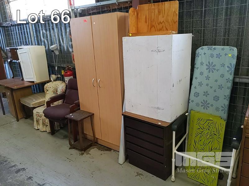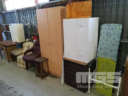 VARIOUS ITEMS OF FURNITURE INCLUDING 2-DOOR STORAGE CUPBOARD, SIDE TABLES, DRESSING CHAIR, OTTOMAN STOOL, FOLDING TABLE, BLIND, BOOK STAND, IRONING BOARD, DECOR PANELS, WALKING FRAME ETC