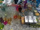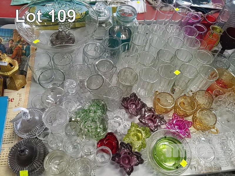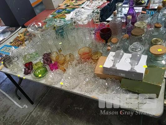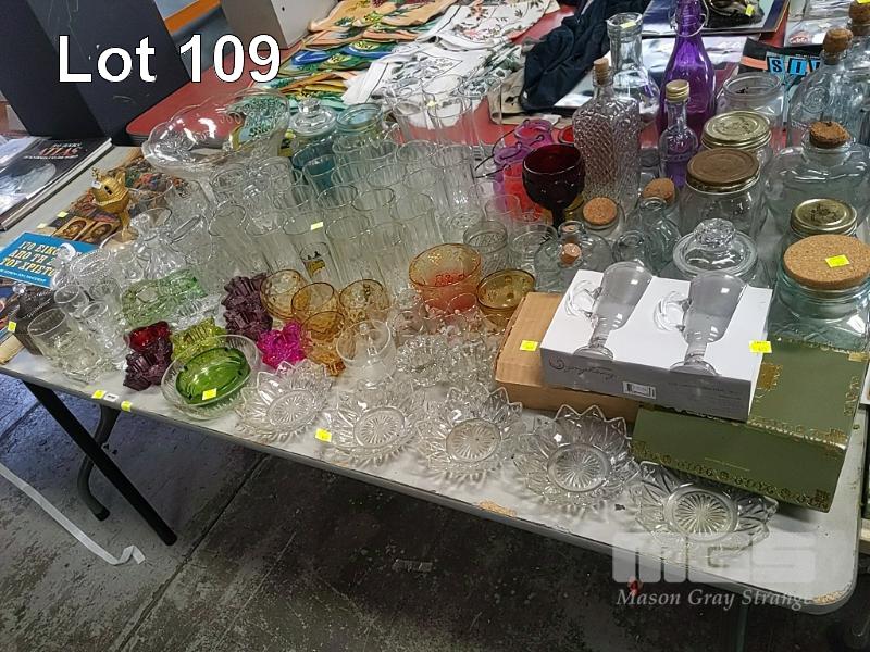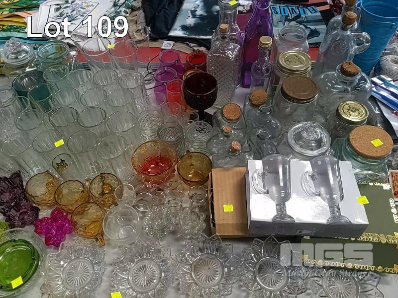 GLASSWARE INCLUDING TUMBLERS, BOWLS, JARS, AMBER GLASS GOBLET, COLOURED GLASS CANDLE POTS, SHOT GLASSES, BEER GLASSES AND MORE (1 x TABLE)