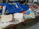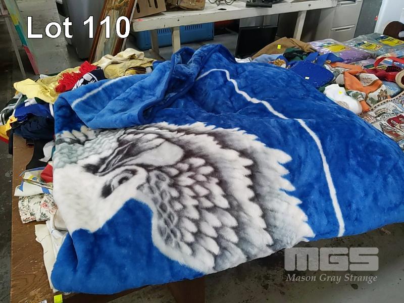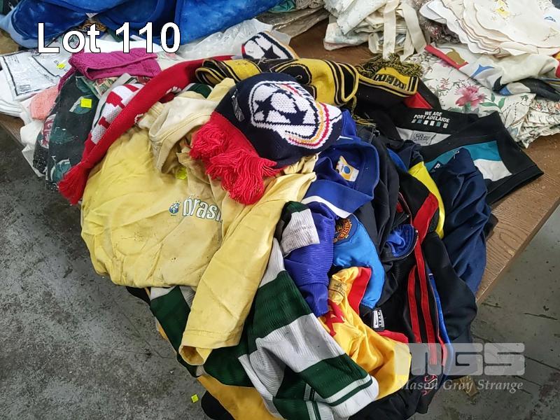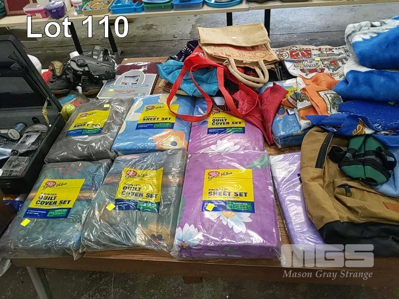 COLLECTION OF HOUSEHOLD LINEN INCLUDING QUILT COVER SETS, SHEET SETS, OLD FOOTBALL GUERNSEYS, TABLE MATS AND MORE (1 x TABLE)
