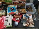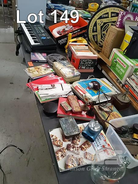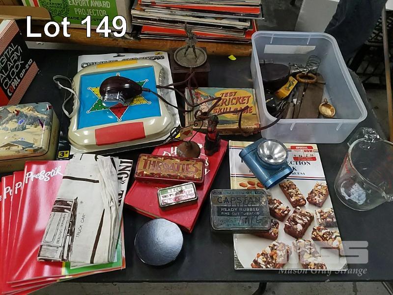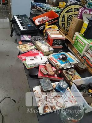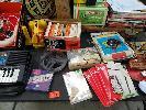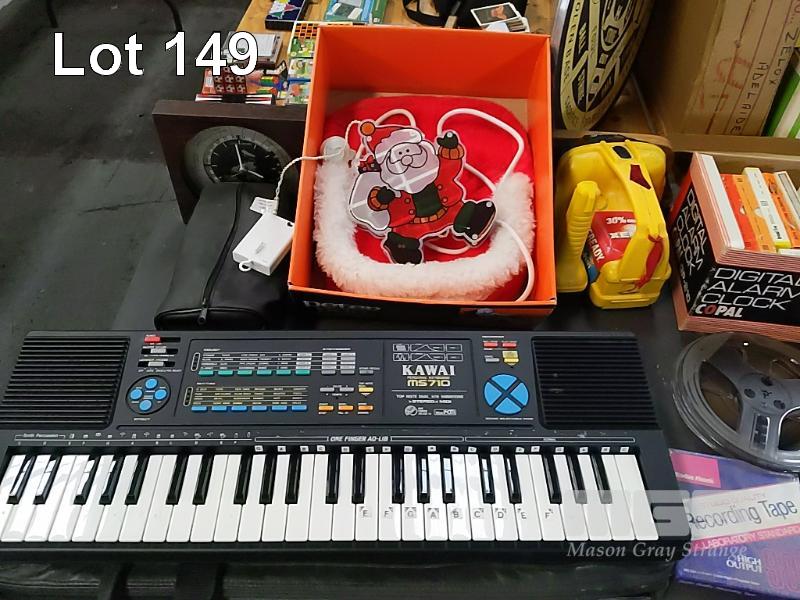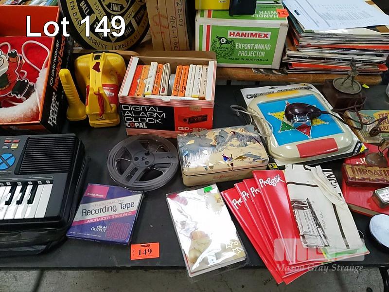 KAWAI KEYBOARD (MS170), REEL TO REEL RECORDING TAPE, OLD GAMES, VINTAGE TINS, VINTAGE SHAVER, VINTAGE PEN KNIVES ETC (1 x TABLE)